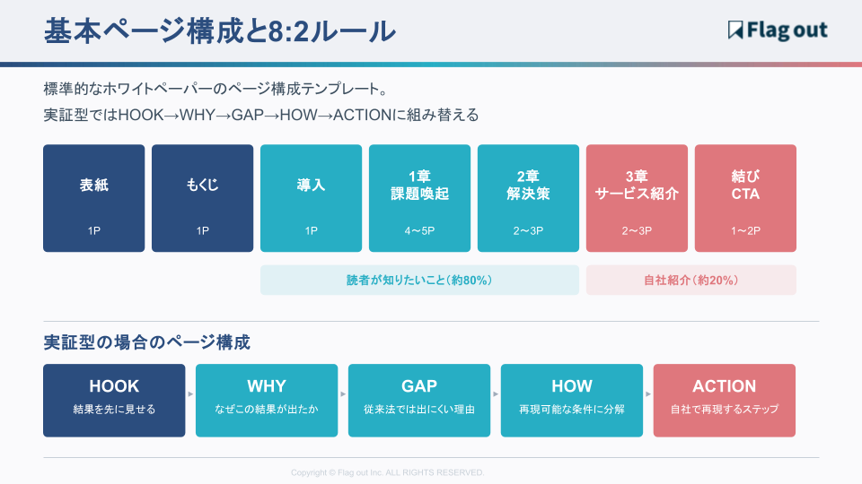 8:2ルールのページ配分:上記の構成では、導入〜2章(約8〜9ページ)が「読者が知りたいこと」、3章〜結び(約3〜4ページ)が「自社の紹介」にあたります。全体の約7〜8割が読者のための情報、2〜3割が自社紹介という配分です。