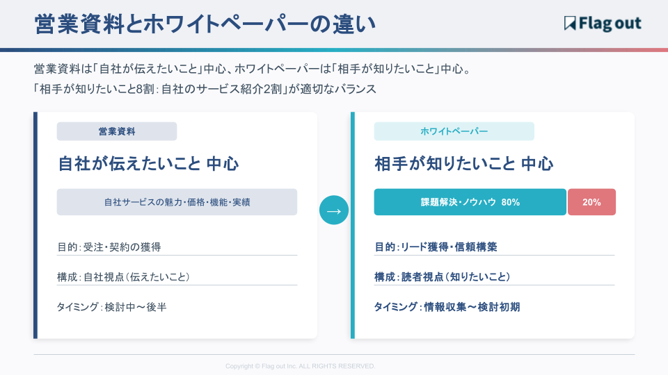 目安として「相手が知りたいこと8割:自社のサービス紹介2割」のバランスが適切です。ホワイトペーパーが「売り込み資料」ではなく「役に立つ情報」として受け取られることで、ダウンロードのハードルが下がり、リード獲得につながります。